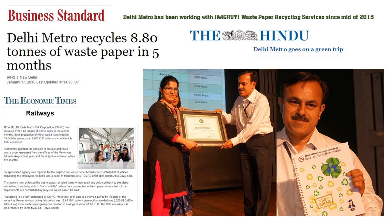 Our work with Delhi Metro Rail Corporation (DMRC) was featured in the press nationwide recently. We have been working with DMRC since mid of 2015 and have been also engaged with confidential document destruction of their records. This photo above shows Miss. Vasudha Mehta, the Co-founder of JAAGRUTI Waste Paper Recycling Services handing over the Certificate of Recycling to the Controller of Stores (CoS) at DMRC at an Environment Day related Function and the DMRC Controller of Stores proudly displaying the Notepad made of recycled paper.